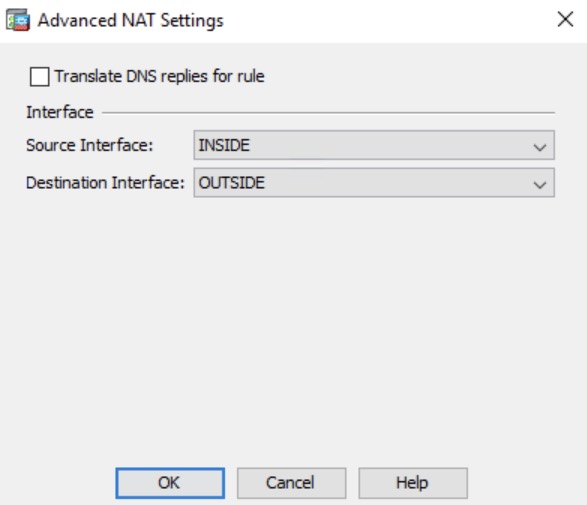 - Select “INSIDE” as your source interface and “OUTSIDE” as your destination interface. This sets the NAT direction to be from your inside network to the outside (Internet)
