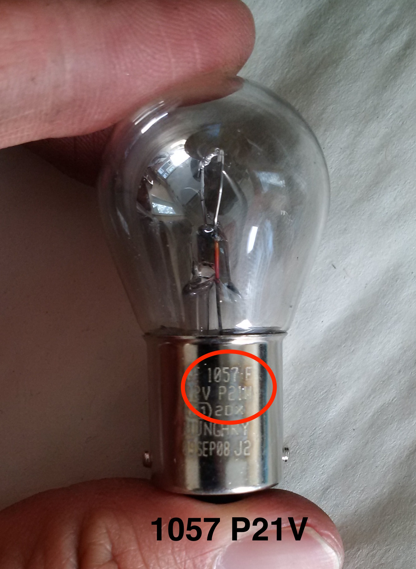 The bulb that burnt out was a GE 1057 P21W. However if you try to search for this, you will notice the part number has changed. So I purchased the equivalent Sylvania 7506 LL instead (It should say Osram 12V P21W on the base of the bulb).