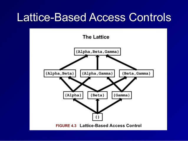 At the highest level of access is the box labeled “Alpha, Beta, Gamma”. A subject at this level has access to all objects in the lattice. At the second tier of the lattice, we see each object has a distinct upper and lower allowable limit. Eg. A subject that has “Alpha, Gamma” access the only viewable objects would be “Alpha and Gamma” objects. Both represent the greatest lower boundary (GLB). The subject would not be able to view object Beta.